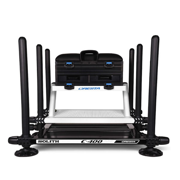 Die Cresta Solith C400 Seatbox 6.36 ist eine Sitzbox mit Aluminiumrahmen und sechs Beinen mit 36 mm Durchmesser. Sie verfügt über ein herausnehmbares Staufach unter dem Sitz mit einer seitlichen Schublade und zwei Schubladen mit Magnetverschluss an der Vorderseite. Der Rahmen ist mit einer stufenlos verstellbaren Fußstütze und einer Wasserwaage ausgestattet. Die Cresta Solith C400 Seatbox 6.36 wird mit einem abnehmbaren Schultergurt mit Clips geliefert.