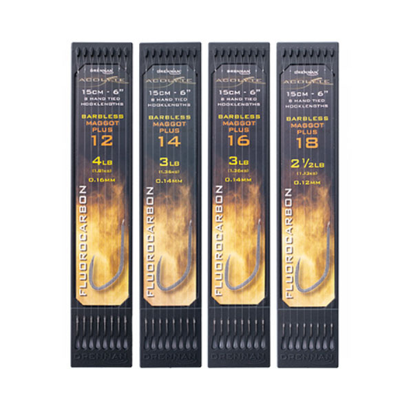 Die Drennan Acolyte Mag+ Hooklengths sind handgebundene Vorfächer mit widerhakenlosen Maggot Plus Haken an Acolyte Fluorocarbon. Die Vorfächer sind 6 Inch/15 cm lang. Die Drennan Acolyte Mag+ Hooklengths eignen sich für Köder wie Maden, Caster und Würmer.