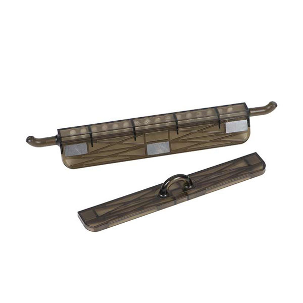 Das FOX Edges Rig & Hanging Rack ist ein neu entwickeltes magnetisches Rig- und Vorfachsystem. Montagen lassen sich befestigen, indem man den Haken in die Schlitze einlegt oder ihn um die Stifte schlingt. An die großen äußeren Haken kann eine Stirnlampe aufgehängt werden.