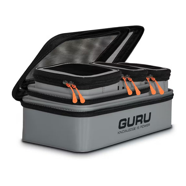 Das Guru Fusion Ventilator Combo 5 ist ein Set aus EVA-Köderbehältern zur Aufbewahrung und zum Transport von Lebendködern. Die Behälter verfügen über belüftete Netzdeckel und sind grau. Die verschiedenen Größen sind stapelbar.