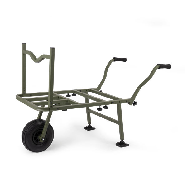 Die Korum Progress Extenda Barrow ist eine Schubkarre mit ausziehbarem Rahmen. Sie ist kompakt für den Transport und lässt sich für den Transport größerer Gegenstände erweitern. Der Rahmen ist zusammenklappbar und verfügt über aufrechte Halterungen zum Aufhängen von Eimern und Säcken.