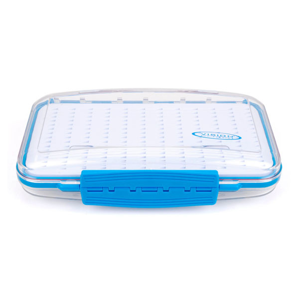 Die Vision Aqua Fly Box ist eine wasserdichte Fliegenbox mit transparentem Kunststoffdeckel im Vision-Fischtarnmuster. Die Medium-Ausführung verfügt über zwei identische, mit Schaumstoff gefüllte Fächer für kleine und mittelgroße Fliegen. Die gLarge-Ausführung hat zwei Fächer mit unterschiedlichem Schaumstoff: Eine Seite ist mit einzelnen Löchern für kleine und mittelgroße Fliegen ausgestattet, die andere mit geraden Schlitzen für Fliegen mit größeren Haken.
